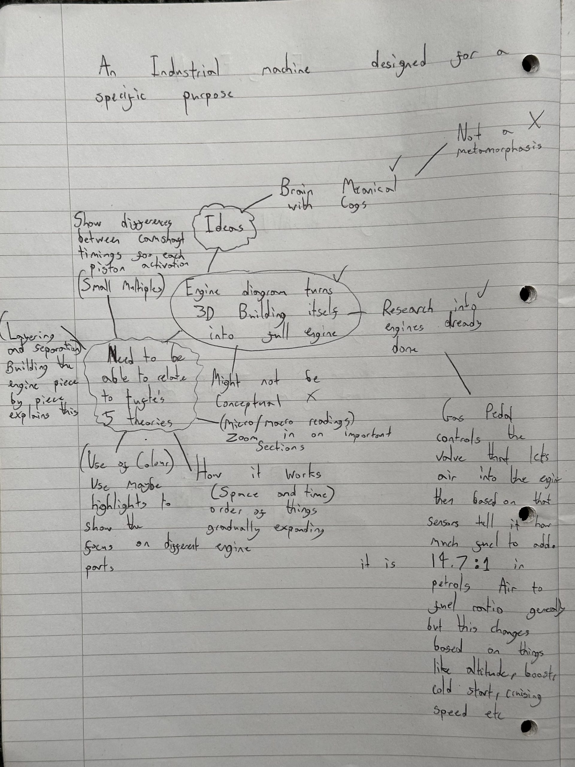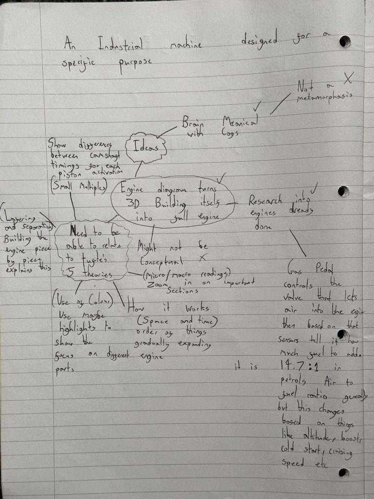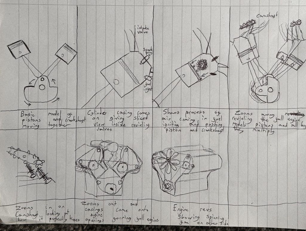 My Initial idea started as a brain made of mechanical cogs however after a bit of thought this didn’t seem feasible or purposeful not matching the brief for the assignment. My next idea was Building on my passion for cars by doing an animation relating to an engine, however i needed to incorporate a transition, which proved harder than i thought. I eventually decided to go with the idea of a diagram turning into a 3D engine, morphing from a 2D labeled diagram into a moving functioning engine in the 3D space.