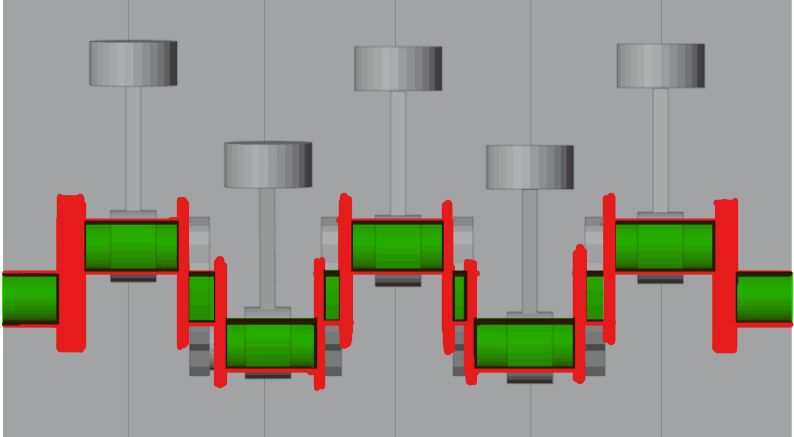 After additional research at the end stages of this project I found a flaw in my design that I now realise would, in reality create a mechanical failure. Unfortunately I found this later on in the project after finalising the design, however being that the brief states the industrial machine can be real or imaginary Im going to ignore this in favour of the idea that my design would be made of a stronger material than a normal engine. The flaw Is that the crankshaft I designed has no central connecting points between the turning points that the pistons connect to, this in reality would cause the crankshaft to bend creating many problems for the engine however if the material was strong enough to not bend at speed this would not be an issue. If i were to do this project again i would learn from my mistake and shape the crankshaft accordingly.