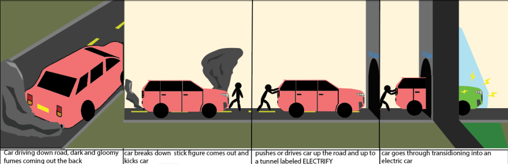 I designed this storyboard to address the positive effects switching to all electric vehicles will have on the sustainability and the environmental impact making the switch can have. I also decided to illustrate that alongside the pollution combustion engined cars are also not always reliable, although i understand neither combustion or electric cars can go without reliability issues it does drive a nice segway between the two. This achieves another one of the goals for the animation by making the two options seem more equal culturally. Rather than electric cars being a novelty they should be considered more as a strong competitor to be compared closely to combustion engine cars in order to find the best solution for the person not basing judgement on whether you should make the switch and more based off the benefits that make EV’s a legitimate competitor to today’s Combustion engined vehicles.