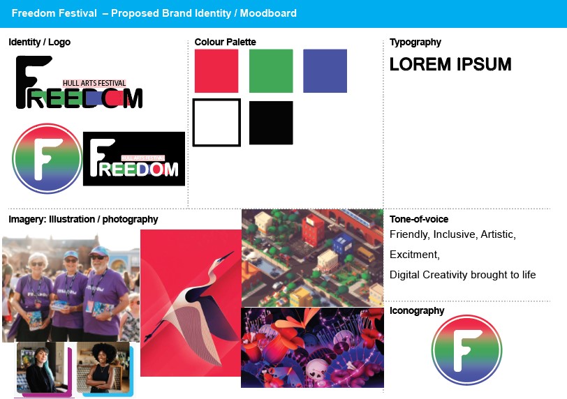 Initially My idea for the Freedom Festival redesign was in a similar direction to the original keeping the typeface logo but changing it to make it different, the goal being to make the brand less childish as with the current brand image the illustration style leans towards a kids event rather than an event for all people as it is intended to be. The problem being it does have to market to both kids and adults being an inclusive event it needs to be visually appealing to all age groups. So in my first attempt at a redesign, I chose a colour palette of primary RGB colours. This was inspired by the changing art scene as digital art takes a more recognised spot in the art community, this is a symbolic change as in my research of the Freedom Festival they tend to use more traditional print friendly colours for their designs so they can print posters and such for advertising. This is less important in a modern space as digital advertisement boards at bus stops and popular locations become more widespread.