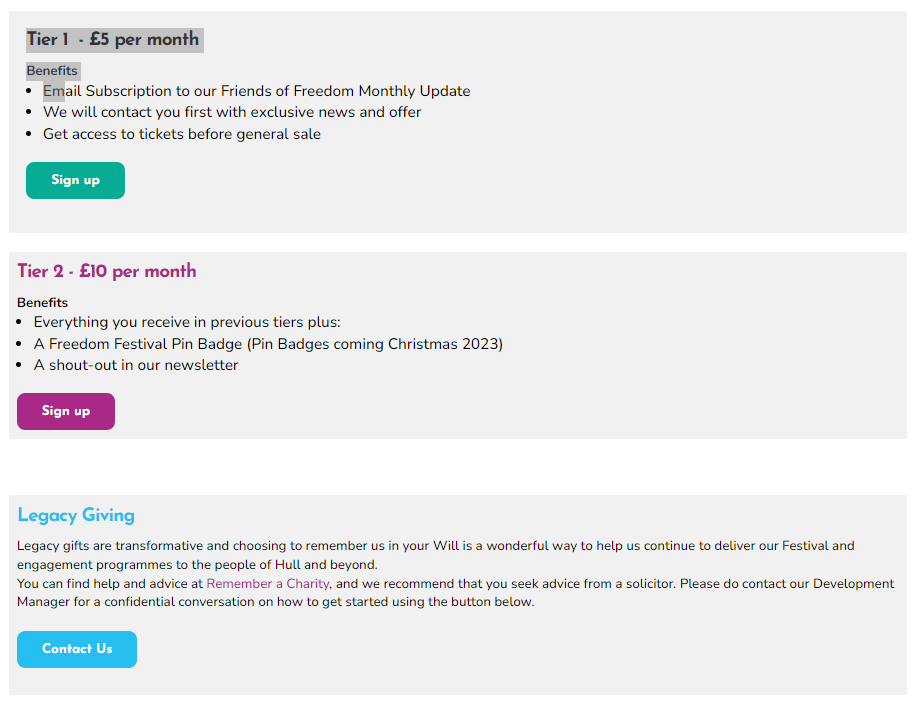 Another avenue to consider when looking at the multichannel visual identity is merchandising the freedom festival currently doesn’t have merchandise but they do have a subscription service for people wanting to help the festival. This could be losing them a lot of free advertising through people wearing their merchandise for example t-shirts from events reminding people of their time potentially even prompting a return to the festival. This is also a no-commitment option for those not willing to pay a subscription but still want to help the event organisers. As long as the brand message and graphic style match the brand image it could be incredibly beneficial to an event like the Freedom Festival, in my redesign, I am going to include some merchandise designs that could be used if the festival were to go in this direction.