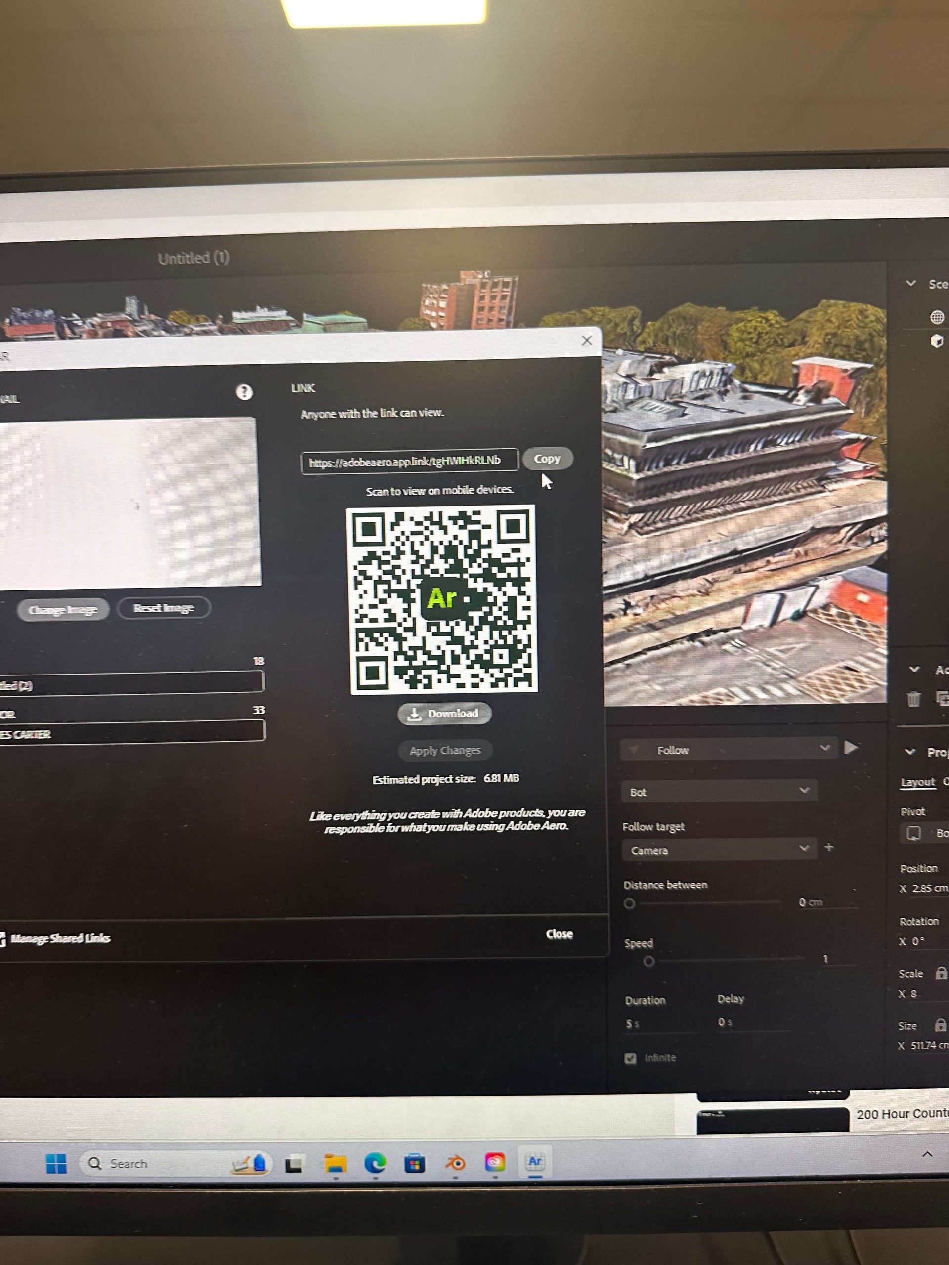 Here is the Zapworks creation we made in this workshop as you can see the device recognises the marker and uses that as a reference for where the camera is in relation to that position giving it all the data it needs to make the model stay in place as the device moves around it making it very easy for items to stay the correct size, this is a unique benefit of marked AR over Unmarked AR as it allows the creator a much more consistent way of setting the size for their creation my making it relative to a real world marker. As for Unmarked AR the best example of a use case in modern every day life is the measure app on an IPhone however you could argue this is more Location marking than unmarked due to its use of the Lidar sensor it uses. The benefits of going with unmarked AR come mostly from the freedom it presents, this is because it removes the need for a trigger and therefore can be used in any location regardless of conditions. Obviously the flaw in this comes when the software cannot decide if it should place the object near or far leading to objects either coming too close or too far away from the operator for them to be effective. This Problem is somewhat solved by location based AR if your device has an accurate idea of its own location as it uses map pinning in order to place its objects in the real world. This was the topic for the second part of the exercise as we moved on to the use of Adobe Aero.